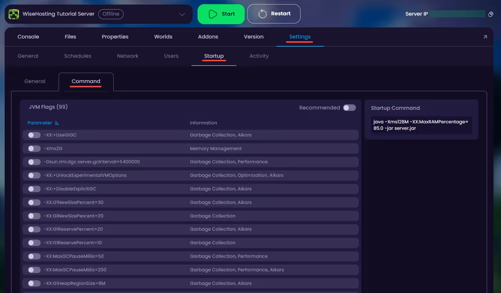 1. Here you can find all the configurable JVM flags. There is also a "Recommended" button which automatically applies all the recommended startup parameters to your server.