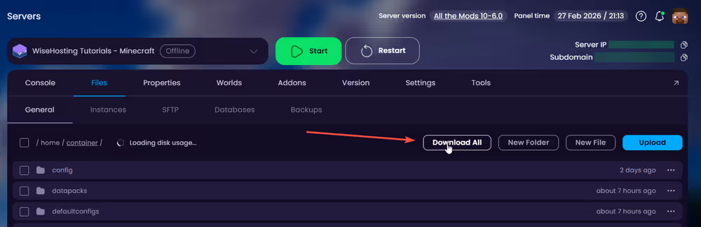 - Click the Download All button to create and download a zipped archive of your entire server.
