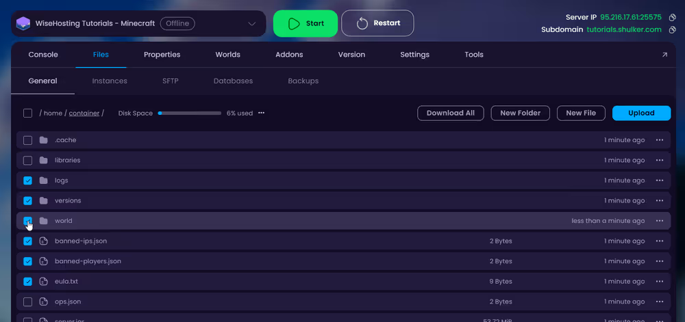 WARNING: Always stop your server before downloading to avoid file corruption or incomplete archives.