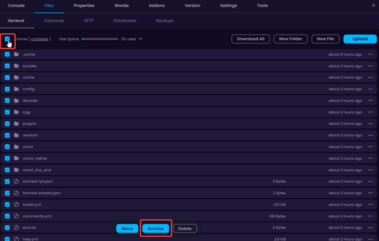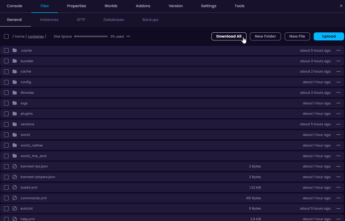 - In the Files tab, you can download a zipped file that contains your entire server by clicking on the Download All button.